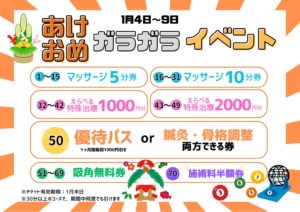 2025.12.23 イベント情報🔔 ■年明けのイベント情報 年明け1/4~1/9の期間中は ガラガライベントを行います! 30分以上のコースで、期間中何度でも引けます! 詳細は画像をご覧ください!! 分からないことがあれば、 スタッフに是非、ご質問ください!!